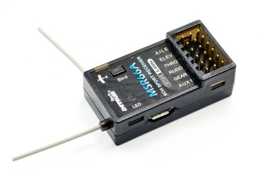 The MSR66A is a mini 6-channel 2.4GHz receiver integrated with 6-axis gyro and suitable for normal wing, fly-wing, and V-tail airplanes. It provides four different flight modes: Gyro off, Normal, Aerobatic, and Auto-Recovery (Auto Balance) and can be programmable from the matched transmitter.